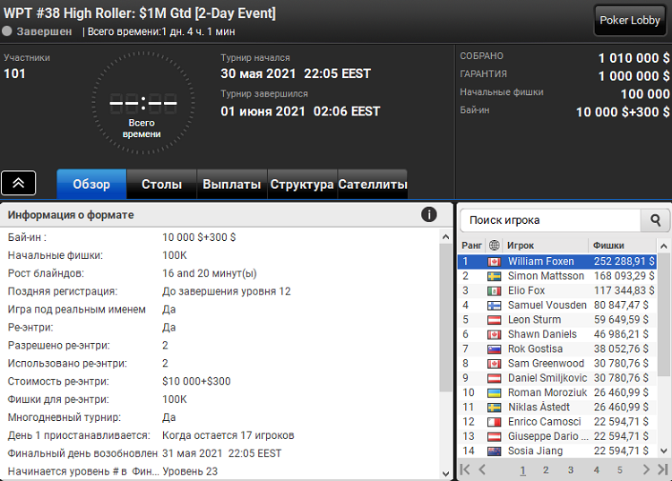 Игрокам удалось слегка перебить гарантию ивента WPT #38 High Roller, собрав 101 вход и сформировался призовой фонд в 1 010 000$.