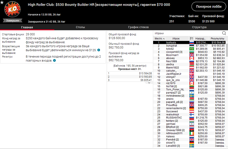 Вчера вечером игрок из России Алексей Истомин одержал победу в нокаут-турнире High Roller Club: Bounty Builder стоимостью 530$ и с гарантией 70 000$.