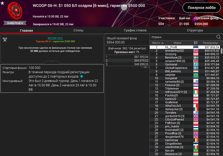 Турнир WCOOP 06-H стоимостью 1 050$ с гарантированными призовыми в 500 000$ собрал неплохое количество входов – 544 (из них ре-энтри составили 194).