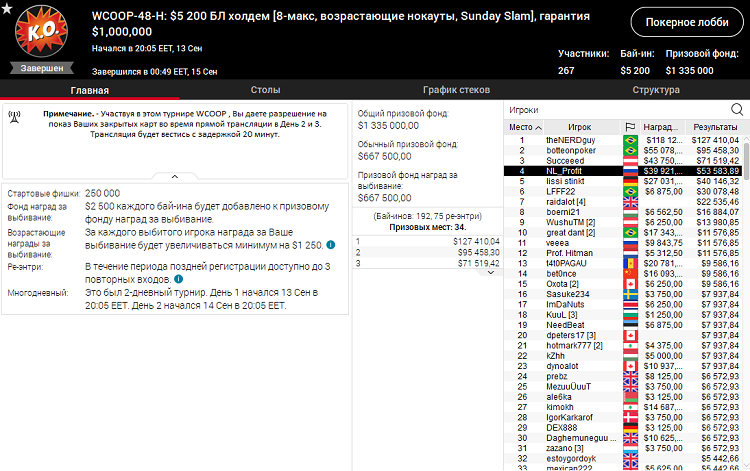 Событие WCOOP-48-H Sunday Slam собрало большое количество входов в 267 энтри и гарантию удалось перебить на внушительную сумму в 335 000$.