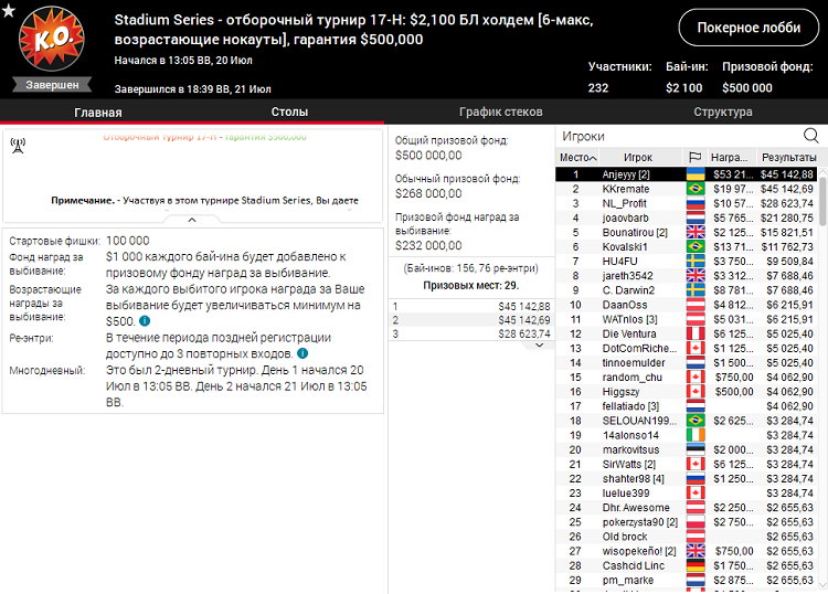 Турнир Stadium Series 17-Н с бай-ином 2 100$ и гарантией 500 000$ собрал 232 входа, которых слегка не хватило, чтобы перебить заявленную гарантию и оверлей ивента составил 12 800$.