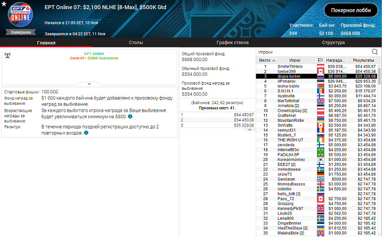 На Старзах завершился очередной дорогой ивент в рамках серии EPT Online. Этим утром подошёл к концу турнир EPT Online 07 с бай-ином 2 100$ и гарантией 500 000$.