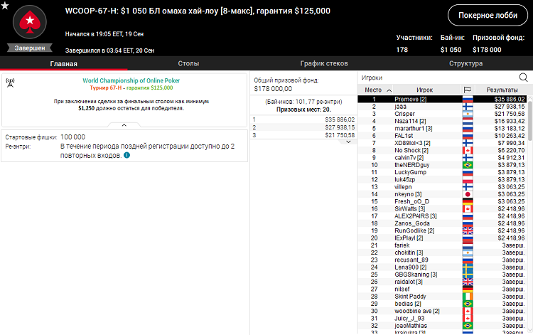 На ежегодной серии WCOOP 2020 на Старзах завершился турнир WCOOP-67-H по Омахе хай-лоу, который обошёлся покеристам в 1 050$ при гарантии в 125 000$. Среди призёров турнира можно увидеть достаточно много россиян.