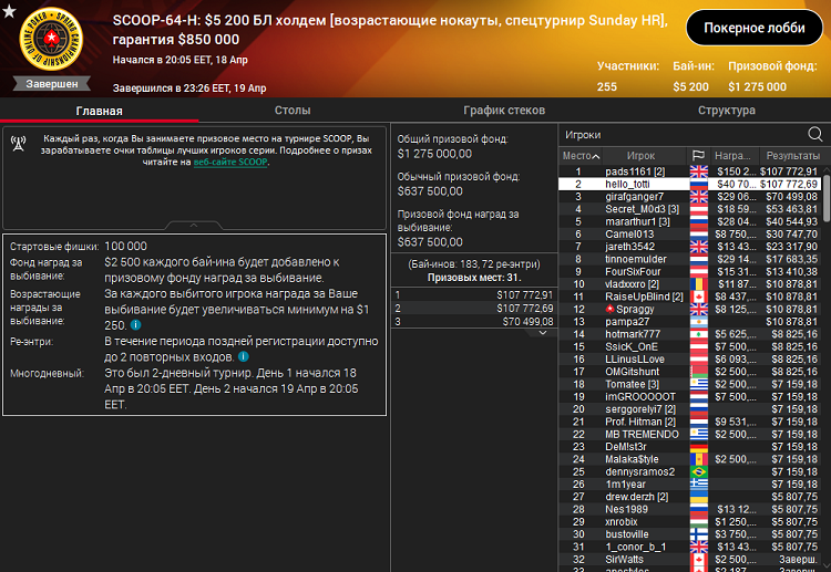 Победить в этом турнире сумел один из лучших самых МТТ-игроков из Великобритании Патрик "pads1161" Леонард, который заработал как чемпион 107 770$ и ещё 150 200$ в качестве баунти.