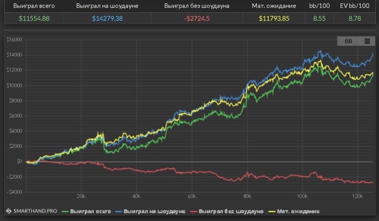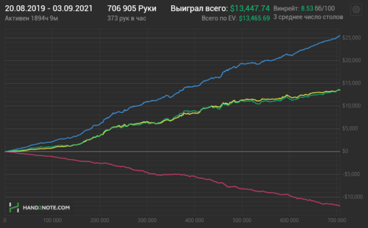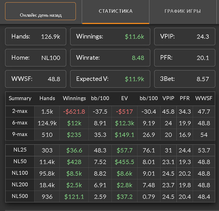 - Статистика за дистанцию 100 000 рук для лимита от NL10 и за дистанцию 50 000 рук для лимита до NL10