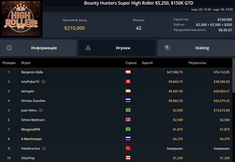 Бенджамин Ролле победил в Bounty Hunters Super High Roller за 5 250$