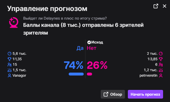 Модератор задает событие и его возможные исходы, а зрители пытаются угадать, используя баллы канала, чем же все закончится. Зрителям, которые угадают результат, полагается соответственная доля от общего количества баллов.