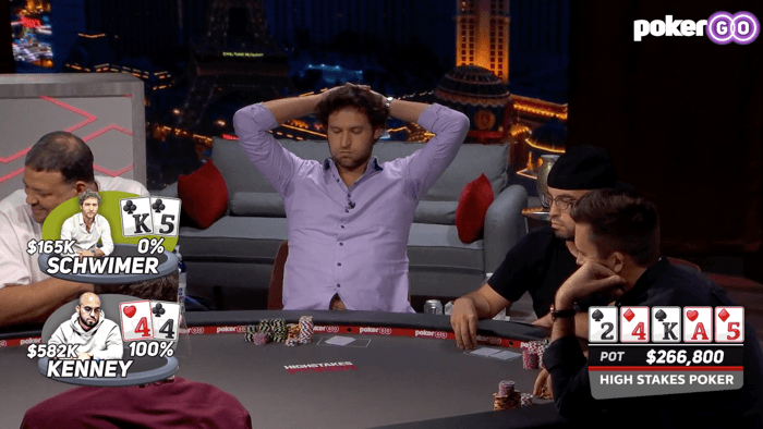В финальной для Швиммера раздаче он поставил с малого блайнда 4 000$ с K♣-5♣, а Кенни в ответ заколлировал с 4♥-4♣. Другие игроки за столом также уравняли и на стол положили флоп 2♠-4♦-K♠, который дал Брину Кенни сет.