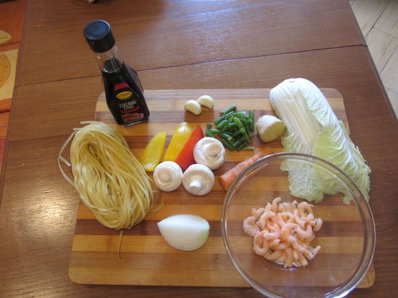 Для начала приготавливаем ингредиенты. Нам понадобится 100 грамм креветок, 3 шампиньона, половинка сладкого перца, два зубчика чеснока, лапша, соевый соус, половинка моркови, стручковая фасоль и имбирь.