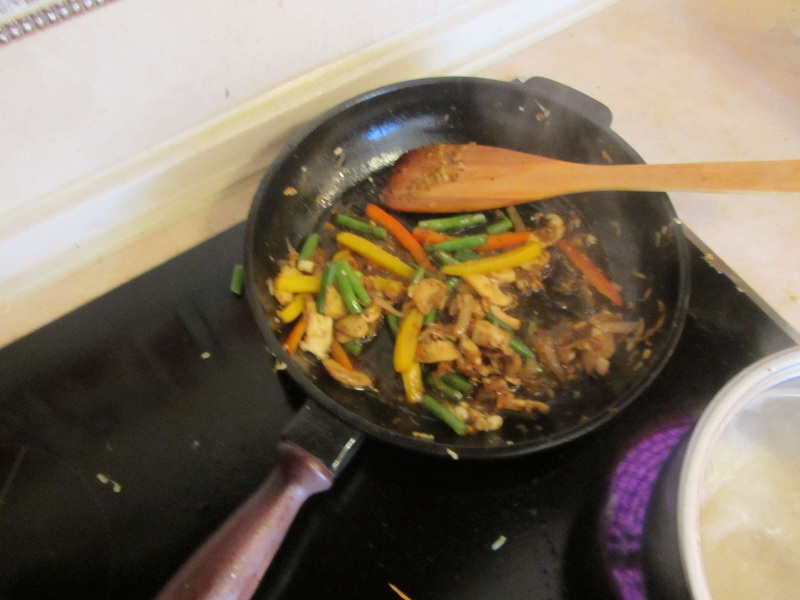 Все наши овощи обжариваем на сковороде. Добавляем туда соевый соус и хорошо перемешиваем.