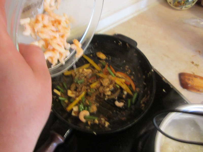Когда овощи уже почти готовы добавляем наши креветки и доводим до готовности.