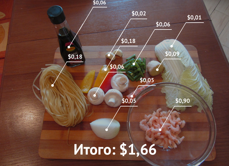 Цена такого блюда составит примерно 1,66$. Ниже в инфографике расписано сколько было потрачено средств на каждый ингридиент:
