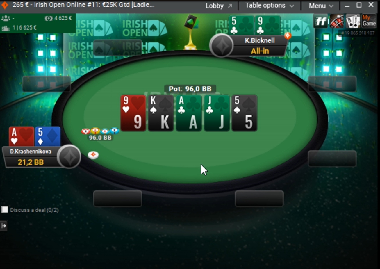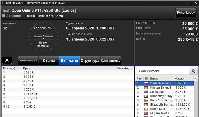 На PartyPoker проходит онлайн-серия Irish Open, в рамках которой 9 апреля состоялся женский турнир с бай-ином 265€. Событие собрало 82 входа и только 12 девушек попало в призы. Они разделили между собой 25 000€.