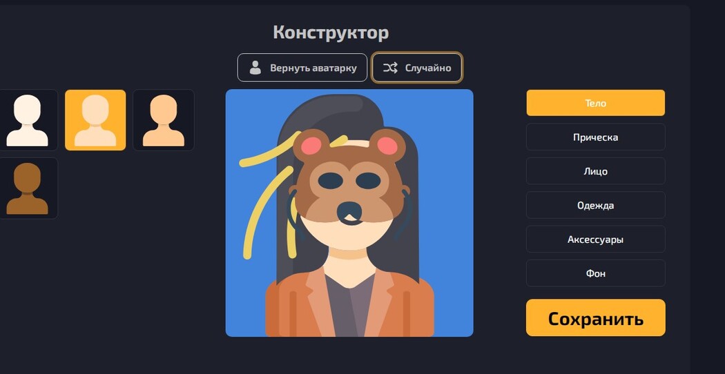 Конструктор позволяет выбрать фон, тело, прическу, лицо, одежду и аксессуар. Также доступен случайный выбор персонажа. Картинку можно постоянно менять, только не забывайте сохраниться, чтобы изменения вступили в силу.