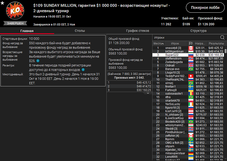 Турнир Sunday Million насчитал за своими столами 11 262 желающих получить свою часть от общего призового фонда в размере 1 126 200$ призовых.
