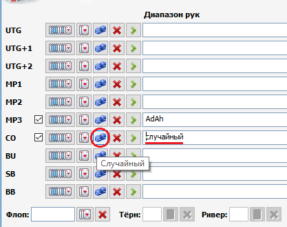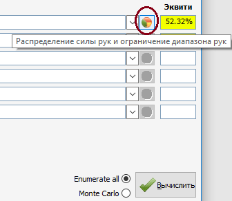 Нажав на игровые кубики (кнопка возле двух карт) вы выберите для игрока случайный диапазон, таким образом эквити будет подсчитано для случайных 2 карт: