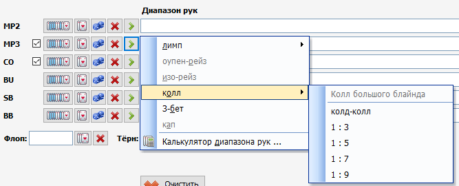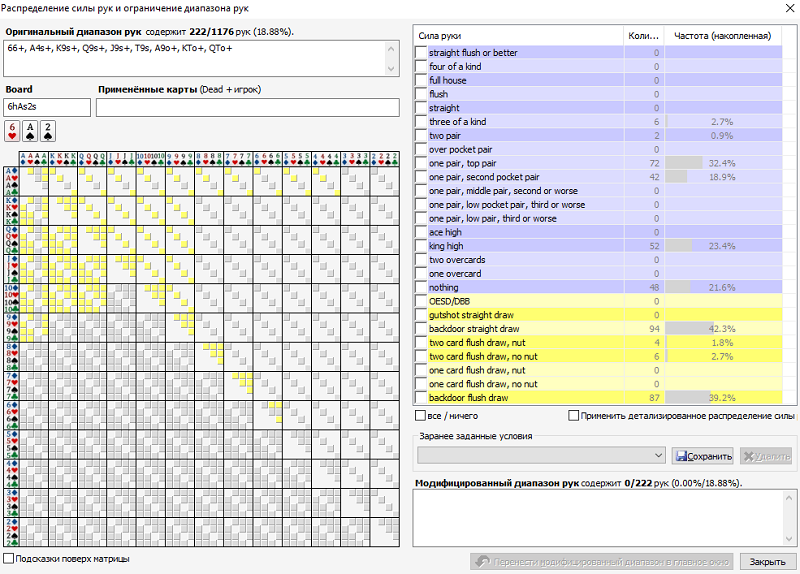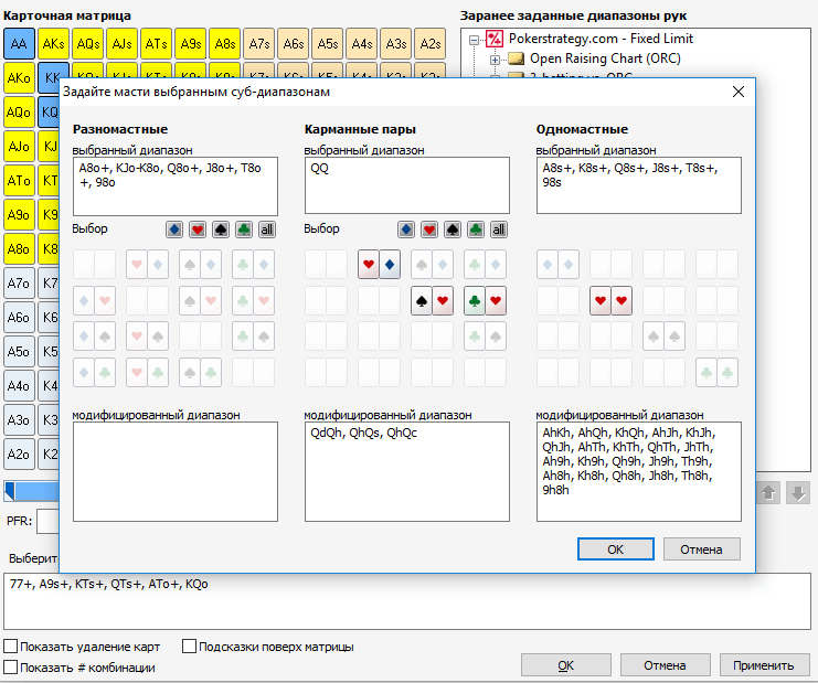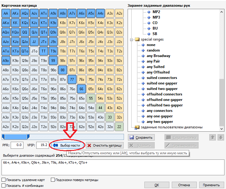 Укажите карманные карты для двух и более игроков − вы можете выбрать как определённые две карты, так и диапазон рук: