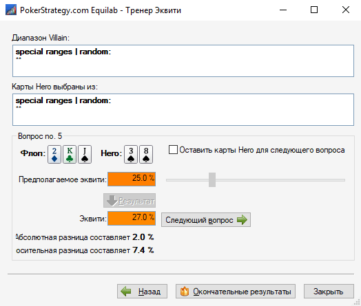 Вы имеете возможность потренироваться в знании эквити. Для этого в лобби Equilab выберите "Настройки"/"Тренер эквити". Вам будет предложено угадывать эквити для случайных карт, либо самим выбрать карты оппонента (Villain) и ваши (Hero).