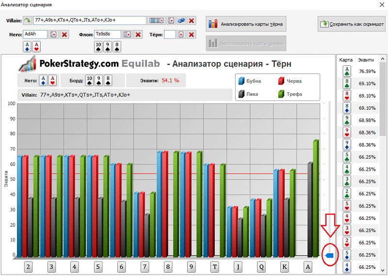 Есть ещё один незаменимый инструмент, которым вы будете пользоваться с целью узнать, как карта тёрна или ривера может изменить ваше эквити, которое вы имеете на флопе. Иными словами, вы увидите, какая карта станет опасной для вас и вынудит принять правильное решение – скинуть карты, или наоборот – сделать ставку/колл, если карта улучшит ваше низкое эквити.
