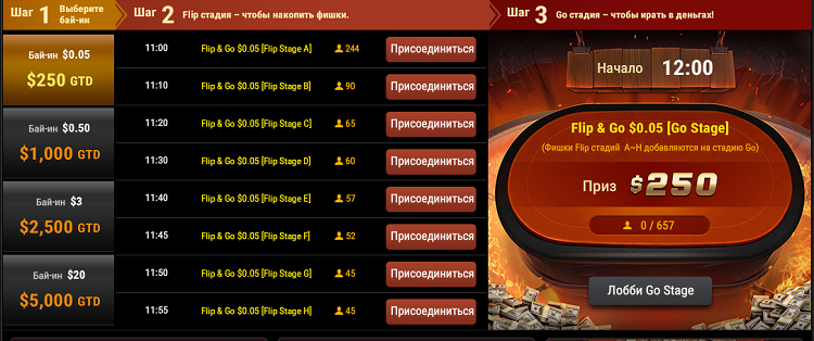 Зарабатывайте деньги во время Flip и проходите дальше! Стадия Go играется как обычный холдем и стартует ежечасно. Вы автоматически попадаете в этап Go, если выиграете этап Flip