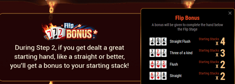 Flip бонус. Если на втором этапе вам выпадет отличная стартовая рука (например, трехкарточный флеш, стрит или сет) вы получите бонус к стартовому стеку!