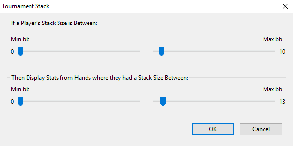 Если вы хотите, чтобы руки отображались конкретно на количестве больших блайндов которые есть у игрока на момент начала раздачи, сопоставьте столбцы, чтобы они были одинаковыми. Например, используйте 0-10 для Player Min & Player Max, затем используйте те же 0-10 для Hands w/Min & Hands w/Max.
