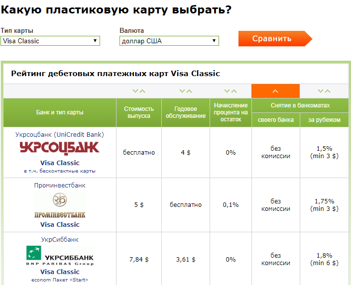 Теперь рассмотрим условия открытия карты с помощью сайта sravnibank.com.ua (указаны только стартовые пакеты, более расширенный список вы сможете узнать на сайтах банков)
