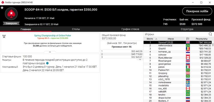 Покеристу, который играет на PokerStars под ником "SpaceyFCB", удача улыбнулась в SCOOP-84-H – турнире по безлимитному холдему за 530$. Событие собрало 745 входов и общий призовой фонд в 372 500$.