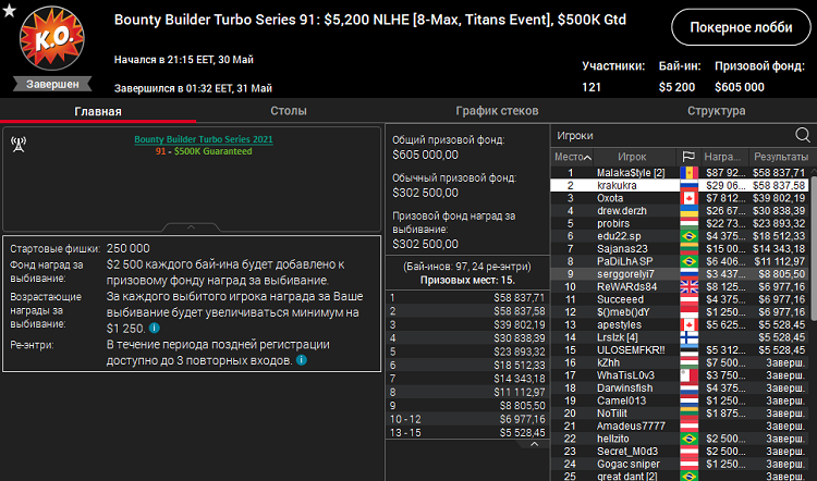 В турнир Bounty Builder Turbo Series 91 был сделан 121 вход и этих энтри хватило, чтобы перебить гарантированные призовые на 105 000$.