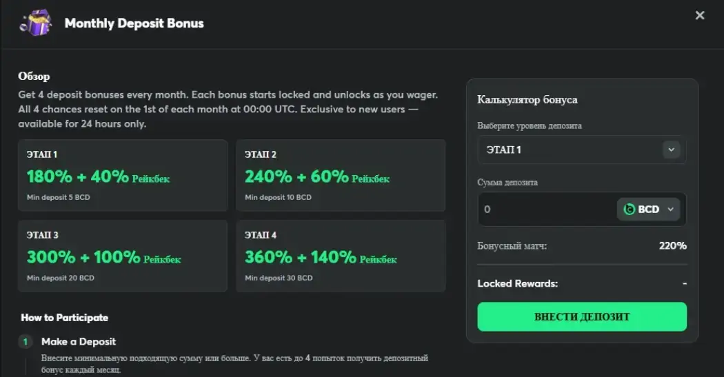 *Каждый бонус изначально заблокирован и открывается по мере совершения ставок. Лимиты обновляются 1-го числа каждого месяца в 00:00 UTC. Предложение в 500% является эксклюзивным для новичков и доступно только в первые 24 часа после регистрации.