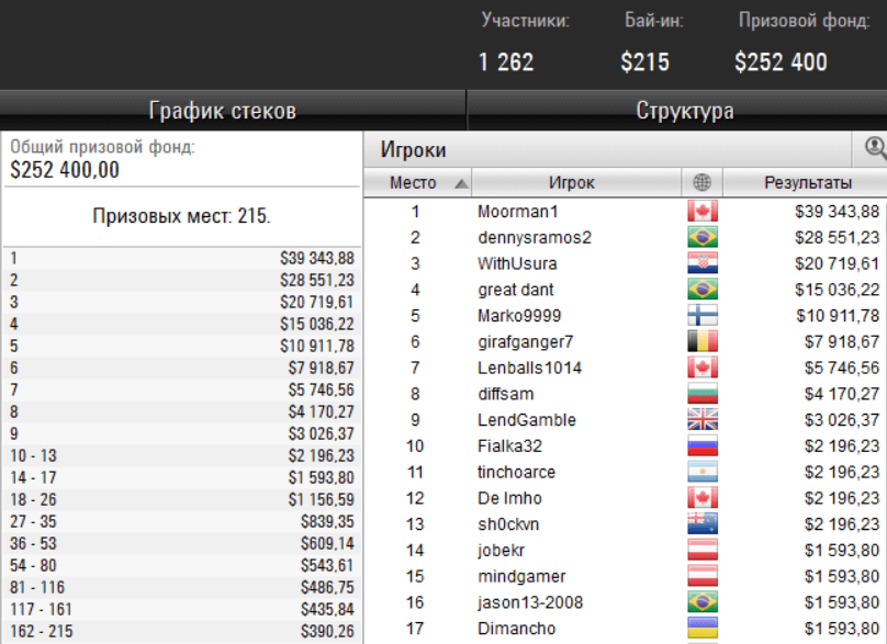 За первое место наш герой получил 39 343$, а результаты турнира выглядят следующим образом: