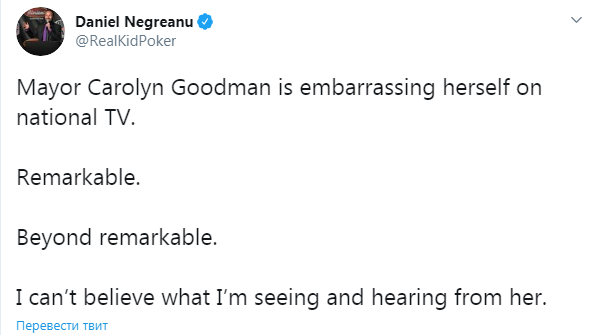 Легендарный покерист Даниэль Негреану отреагировал на подобные заявления Каролин Гудмэн в своём Твиттере: