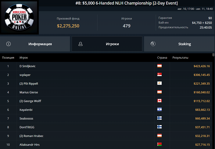 Ивент #8 6-Handed NLH Championship сумел собрать довольно внушительный призовой фонд благодаря 479 входам.