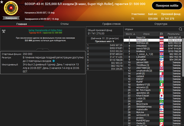 На днях в турнире суперхайроллеров SCOOP-43-H с бай-ином 25 000$ и гарантией 1 500 000$ сформировалась крепкая финалка. Благодаря 71 входу гарантию удалось перебить на 241 370$.