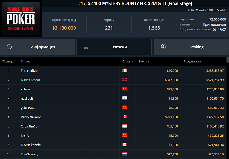 Победу одержал покерист из Ирландии "FutureofMe", которы получил за первое место 285 410$ (в т.ч. баунти 49 000$).