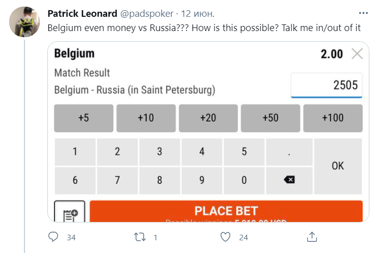 Тем не менее покерист не смог обойти эту ставку стороной, увидев коэффициент – 2.00 в пользу Бельгии. Леонард решил рискнуть, поставив две с половиной тысячи долларов и получил профит на эту же сумму после того, как Россия проиграла Бельгии со счётом 0:3.