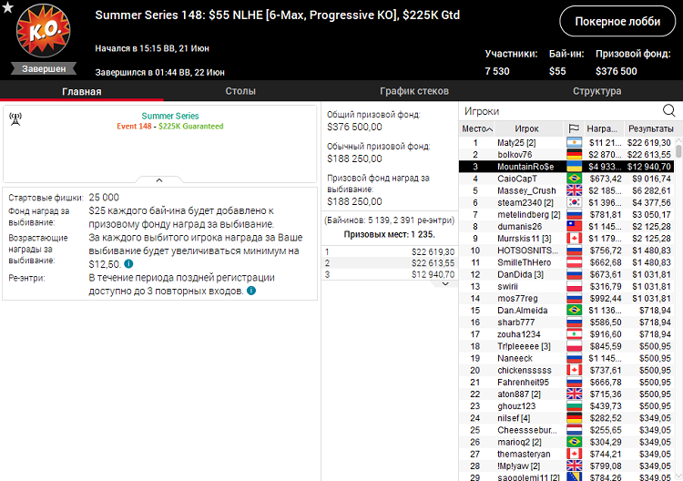 В турнире Summer Series 148 насчиталось 7 530 входов, которые уверенно перебили гарантию и сформировали призовой фонд в размере 376 500$.