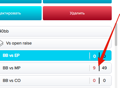 Если значение руки было с весом отличным от 100% то, пользователю нужно воспользоваться радиокнопками для распределения веса руки. Например, если значение руки было 50% Raise 50% Call, то нужно выбрать радиокнопку со значением 50 и кликнуть на Raise или Call. Следующий клик по оставшейся кнопке автоматически заполнит вес до 100%. Таким образом повторно кликать на радиокнопку со значение 50 не нужно.