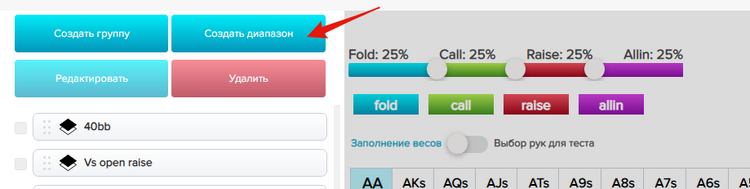 За игровым столом пользователю будут раздаваться только выбранные руки для теста из выбранных диапазонов