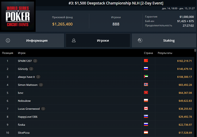 Боллее крупные призовые в 182 210$ заработал победитель ивента, игрок из Китая (КНР) "SPARK1207". На четвёртом месте оказался известный шведский покерист-хайроллер, сыгравший под норвежским флагом – Саймон Мэттсон с призовыми 83 490$.