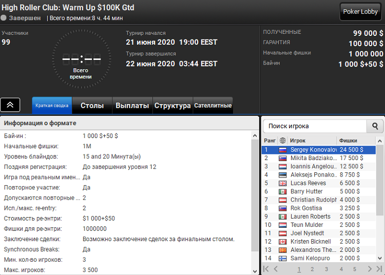 Победителем ивента High Roller Club Warm Up стал покерист из России Сергей Коновалов, который заработал за победу 24 500$.