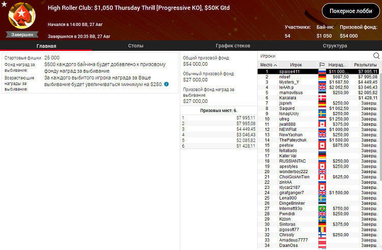 За победу в ивенте High Roller Club: Thursday Thrill россиянин "spaise411" заработал 7 990$ + баунти 11 000$. В турнире собралось 54 входа, которые перебили гарантию на 4 000$.