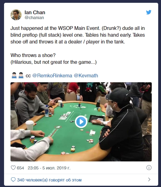 Перевод твита: Только что в Мейн Ивенте. Пьяный (?) игрок пошел в олл-ин на префлопе вне очереди. Взял свой кроссовок и бросил в дилера.