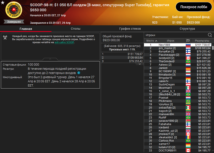 Российский игрок под ником "Nes1989" стал чемпионом спецтурнира SCOOP-98-H Super Tuesday, который стоял игрокам 1 050$ при гарантированных призовых в 650 000$.