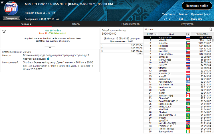 Чемпионом Mini EPT Online 16 Main Event стал покерист из России под ником "edyvpakistan", который заработал крупнейшие призовые за всю свою карьеру в 79 130$.