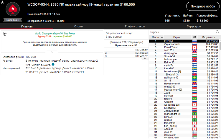 В рамках WCOOP 2020 на PokerStars завершился ивент WCOOP-53-H по Омахе с бай-ином 530$ и гарантией 100 000$. Уже практически традиционно в хедз-ап турнира попало двое россиян, а именно игрок под ником "lExPlay" и популярный покерный стример и покерист Ринат "Zapahzamazki" Ляпин.