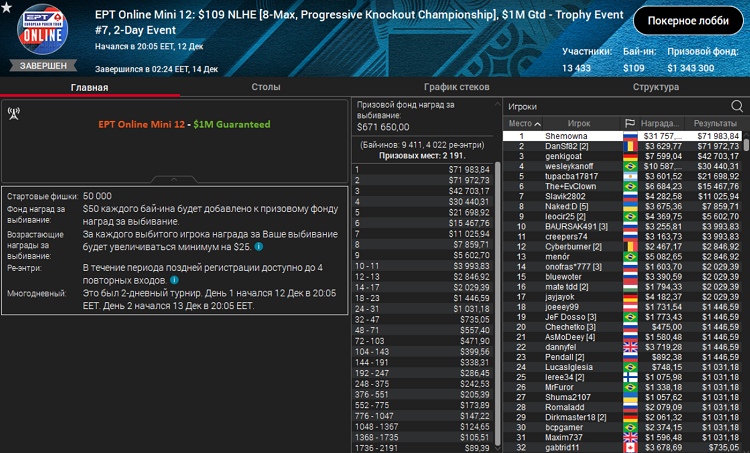 На PokerStars завершился очередной турнир в рамках серии EPT Online. На этот раз вместо привычного Sunday Million с бай-ином 109$ прошёл ивент EPT Online Mini 12 с аналогичной стоимостью и гарантией в 1 000 000$.