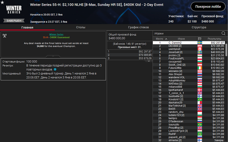 Турнир Winter Series 55-H Sunday HR SE сумел собрать за своими столами 240 желающих побороться за часть от общего призового фонда в 480 000$.