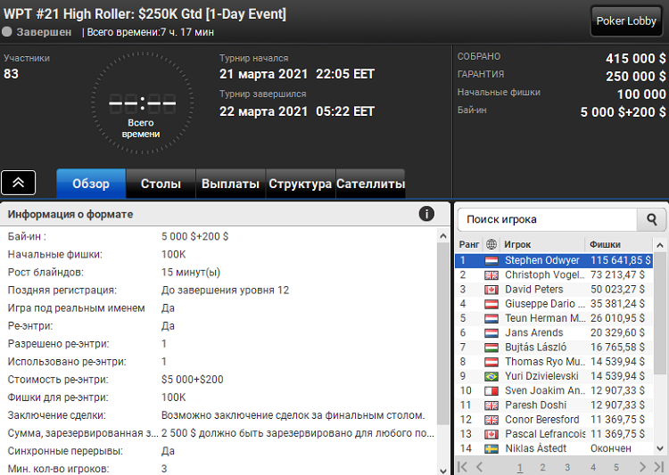 Стив О'Двайер стал чемпионом турнира WPT High Roller