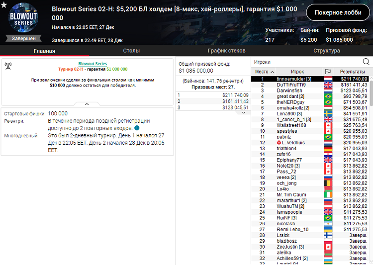 Турнир собрал 217 входов, благодаря чему гарантию легко удалось перебить и сформировать призовой фонд в размере 1 085 000$.